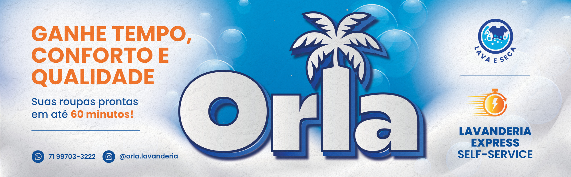 Na Orla Lavanderia Express, você tem autonomia total. Traga suas roupas, escolha a máquina, acompanhe todo o processo e finalize em pouco tempo.
